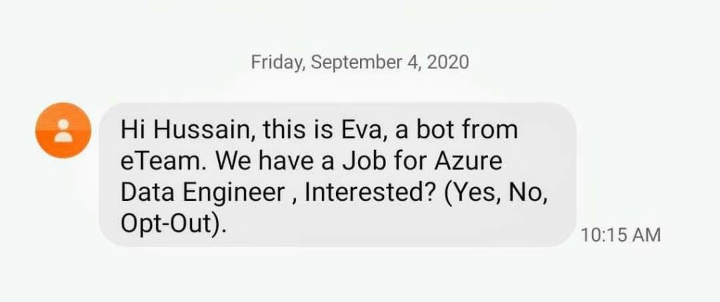 “ഇത് “ഇവ” ആണ്. ഞാൻ ഇടീമിൽ നിന്നുള്ള ഒരു “Bot” ആണ്. മൈക്രോസോഫ്ട് Azure ഡാറ്റ എഞ്ചിനീയർ ആയി ഒരു ജോലി ഒഴിവുണ്ട്. താങ്കൾക്ക് താല്പര്യം ഉണ്ടോ?”