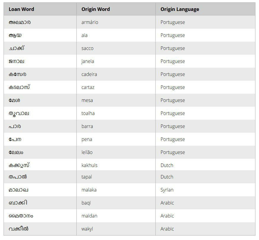 കപ്പയും റബ്ബറും പുറത്തു നിന്ന് രണ്ടു കയ്യും നീട്ടി സ്വീകരിച്ച മലയാളികൾനമ്മുടെ നാട്ടിൽ വന്ന വിദേശ ഭാഷകളിൽ നിന്നുള്ള വാക്കുകളാൽ മലയാളത്തെ സമ്പന്നമാക്കി. കുറെയേറെ വാക്കുകൾ ആദ്യമായി നമ്മുടെ നാട്ടിൽ വന്ന പോർട്ടുഗീസ് ഭാഷയിൽ നിന്നായിരുന്നു. അലമാരയും അൾത്താരയും ചായയും മുതൽ ജനാലയും കളസവും വരെ, കസേരയും കശുവണ്ടിയും കടലാസും മുതൽ ഞാൻ പഠിച്ച സെയിൻ്റ് ആന്റണീസ് സ്കൂൾ സ്ഥിതി ചെയ്തിരുന്ന കൊവേന്ത ജംഗ്ഷനിലെ കൊവേന്ത വരെ, മേശയും പേനയും മുതൽ സെമിത്തേരി വരെ, വരാന്ത മുതൽ വിനാഗിരി വരെ.