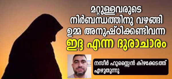 ബാപ്പ മരിച്ചപ്പോൾ എനിക്ക് നാട്ടിൽ പോകാൻ കഴിഞ്ഞില്ല. പക്ഷെ ഏതാണ്ട് എല്ലാ ദിവസവും ഞാൻ ഉമ്മയെ വാട്സാപ്പിൽ വിളിക്കാറുണ്ട്. ആദ്യം വിളിക്കുമ്പോഴെല്ലാം ഉമ്മ ഒന്നുകിൽ നിസ്കാരത്തിലോ ഖുർആൻ ഓതുകയോ മറ്റോ ആയിരിക്കും. പക്ഷെ കുറച്ചു ദിവസങ്ങൾ ആയി ഞാൻ ഒരു കാര്യം ശ്രദ്ധിക്കുന്നു, പുള്ളിക്കാരി ഏതാണ്ട് ഇപ്പോഴും വെളുത്ത വസ്ത്രമാണ് ധരിക്കുന്നത്, ദേഹത്ത് കിടന്ന സ്വർണ ആഭരങ്ങൾ അപ്രത്യക്ഷം ആയി, തലയിൽ ഇതുവരെ കാണാത്ത ഒരു കറുത്ത തുണി കൊണ്ട് മുടി മറച്ചതും ശ്രദ്ധയിൽ പെട്ടു. ചോദിച്ചപ്പോൾ... Continue Reading →