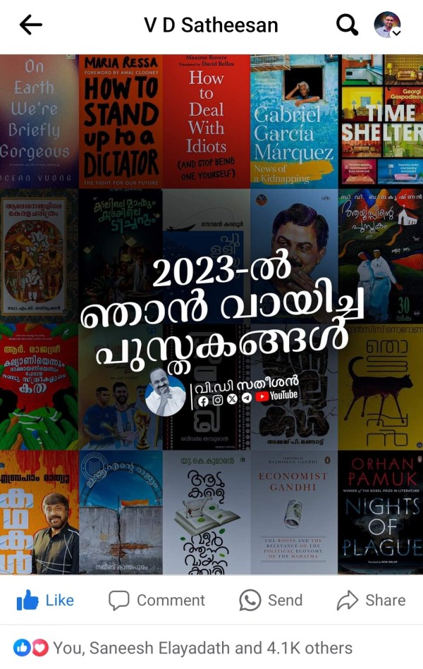 പ്രതിപക്ഷ നേതാവ് ശ്രീ വി ഡി സതീശൻ കഴിഞ്ഞ വർഷം വായിച്ച പുസ്തകങ്ങളുടെ ലിസ്റ്റ് കണ്ടു. രാഷ്ട്രീയക്കാർ വായിക്കുന്ന പുസ്തകങ്ങൾ എനിക്ക് വളരെ താല്പര്യമുള്ള വിഷയമാണ്. പൊതുവെ ശാസ്ത്ര സാങ്കേതിക പുസ്തകങ്ങൾ കൂടുതൽ വായിക്കുന്ന എനിക്ക് സാമൂഹിക ബോധവും അറിവും നൽകുന്നത് പലപ്പോഴും ഇവർ വായിക്കുന്ന പുസ്തകളിലെ ചിലവയിൽ കൂടിയാണ്. ഉദാഹരണത്തിന് എല്ലാ വർഷവും മുൻ അമേരിക്കൻ പ്രസിഡന്റ് ഒബാമ ഇടുന്ന പുസ്തകങ്ങളുടെ ലിസ്റ്റിൽ നിന്നാണ് യുവാൻ ഹരാരിയുടെ Sapiens മുതൽ ഇസബെൽ വില്കഴ്സൺ എഴുതിയ "Caste:... Continue Reading →